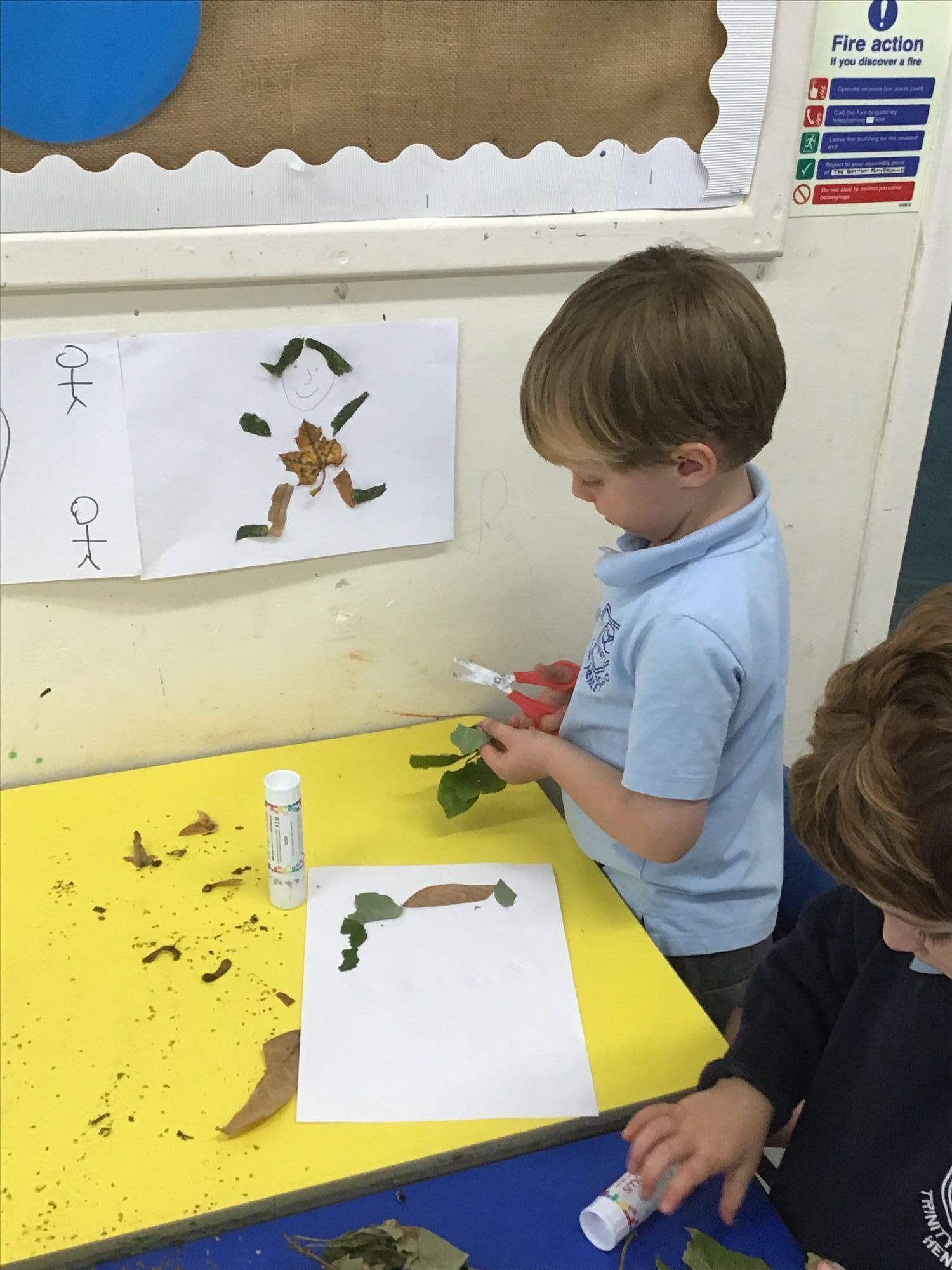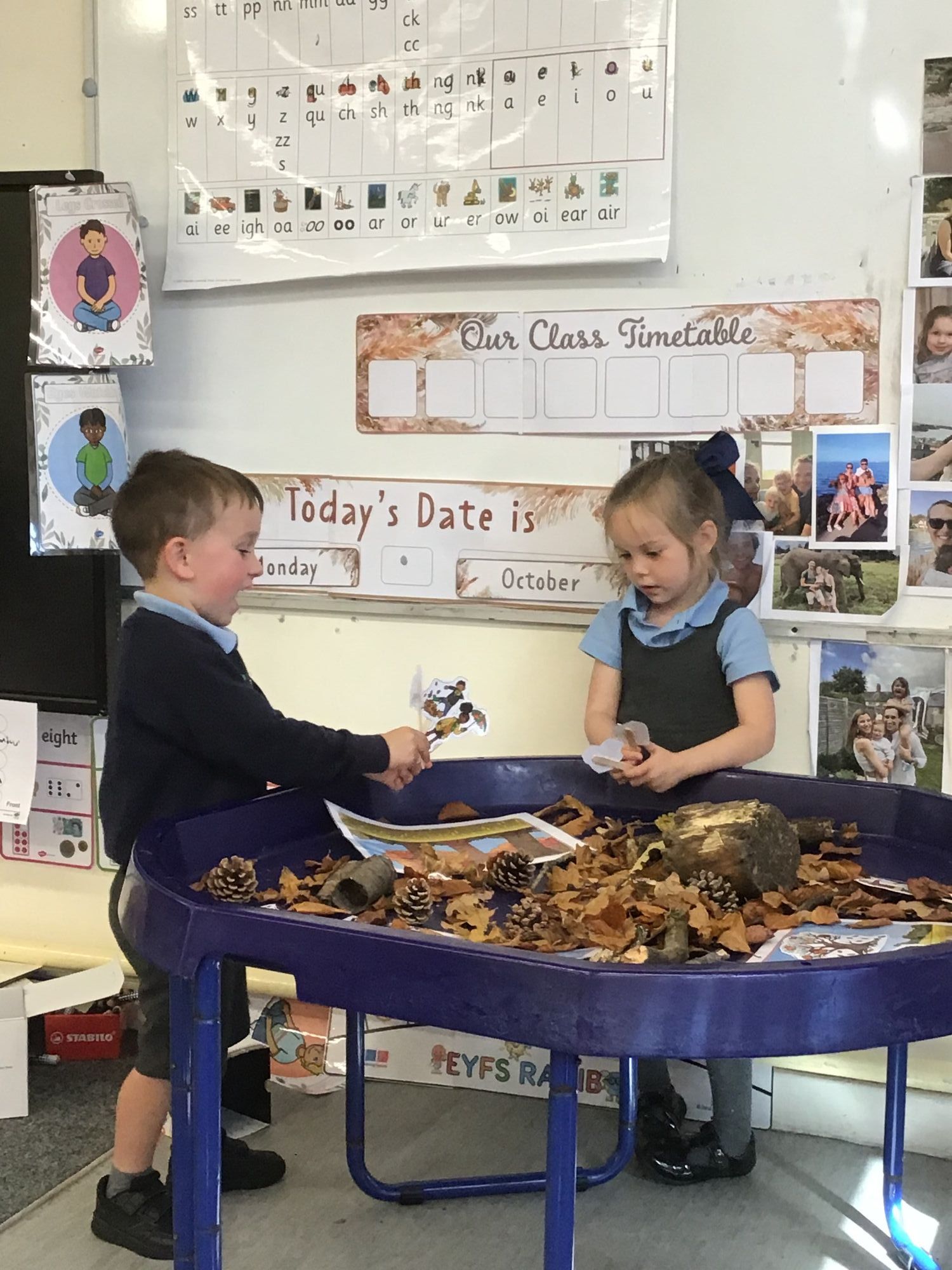 This week the children have been exploring all things relating to Autumn! They went on a leaf hunt around the school, did leaf rubbings and leaf collages. In the classroom, we have set up a Autumn cafe role play area and a campfire role play for the children to enjoy. They have also explored autumn small world role play with puppets.
