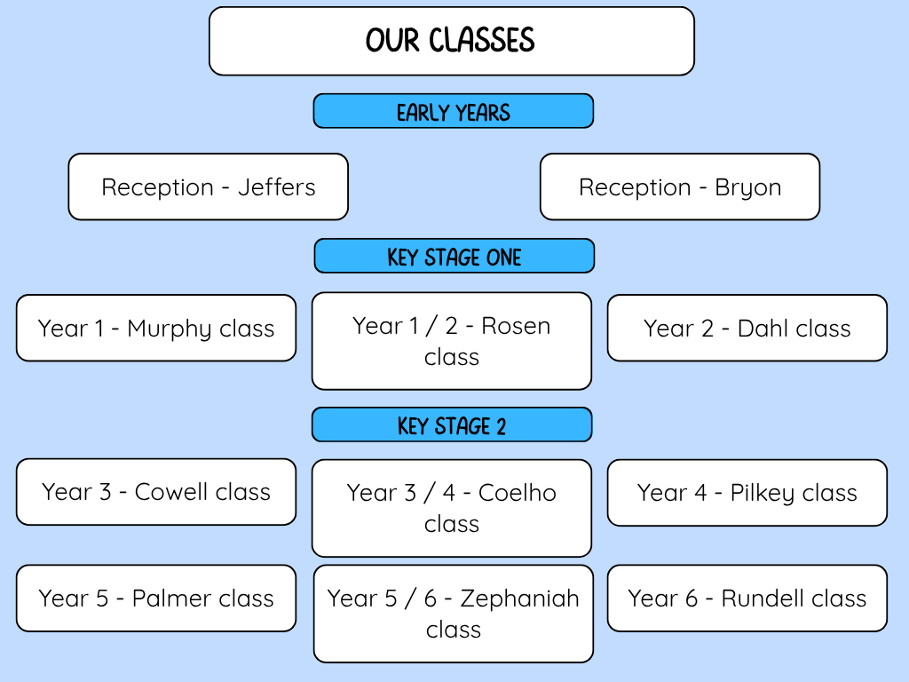 A split year group class includes pupils from more than one year group. These split year classes run alongside our non-split classes. Please see the diagram below. Our classes are named after famous children's authors.